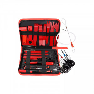 A készlet számos elemet tartalmaz, - a 12 darab különféle kárpitlehúzó mellett található benne csapszegfogó, 2 csapszeghúzó (22,5 és 31 cm), valamint 8 autórádió eltávolító, 11 tűkulcs, egy zárbetét nyitó és 4 tömítéslehúzó.