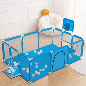 Nagyméretű gyermek járóka és játszótér focikapukkal és kosár palánkkal, kék színben